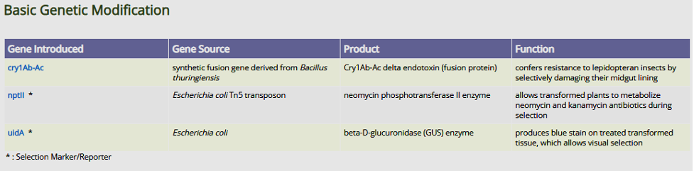 GM Traits: Lepidopteran insect resistance , Antibiotic resistance , Visual marker