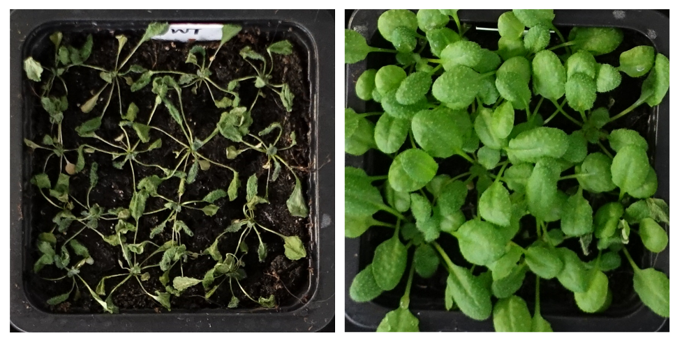 Figure: Wild type (left) and genetically modified Arabidopsis plant (right) after drought stress. Photo: Heidelberg University / COS