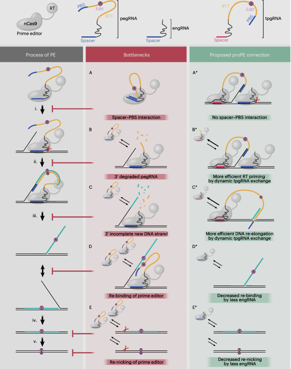 Schematic representation of the PE process depicting the steps (i–v), where potential bottlenecks (A–E) may inhibit PE efficiency that are eliminated by the proposed corrective mechanisms of proPE (A*–E*). nCas9, nickase Cas9.