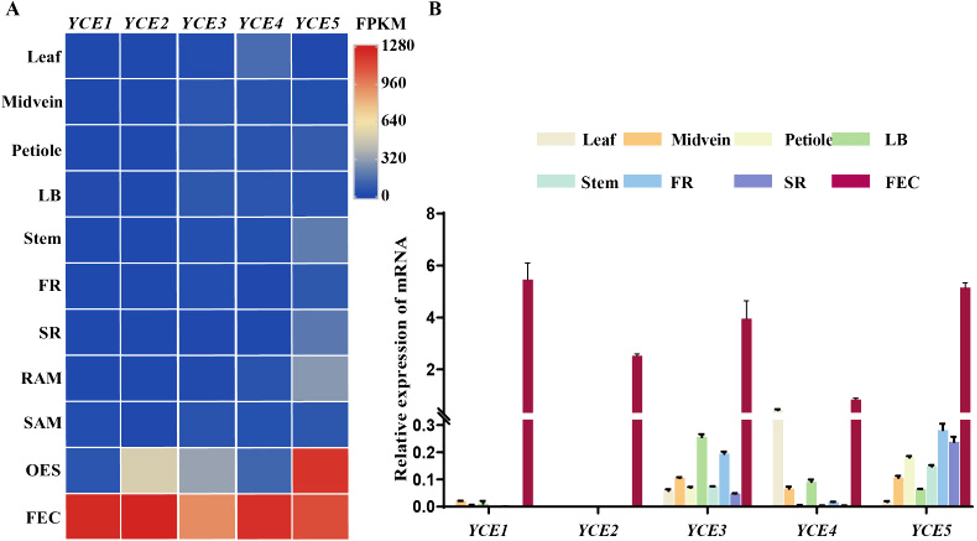 Identification of callus-specific expressed genes. (A) Candidate genes with high expression levels in callus tissues. LB, lateral bud; FR, fibrous root; SR, storage root; RAM, root apical meristem; SAM, shoot apical meristem; OES, organized embryogenic structures; FEC, friable embryogenic callus. (B) Validation of callus-specific highly expressed genes by RT-qPCR.