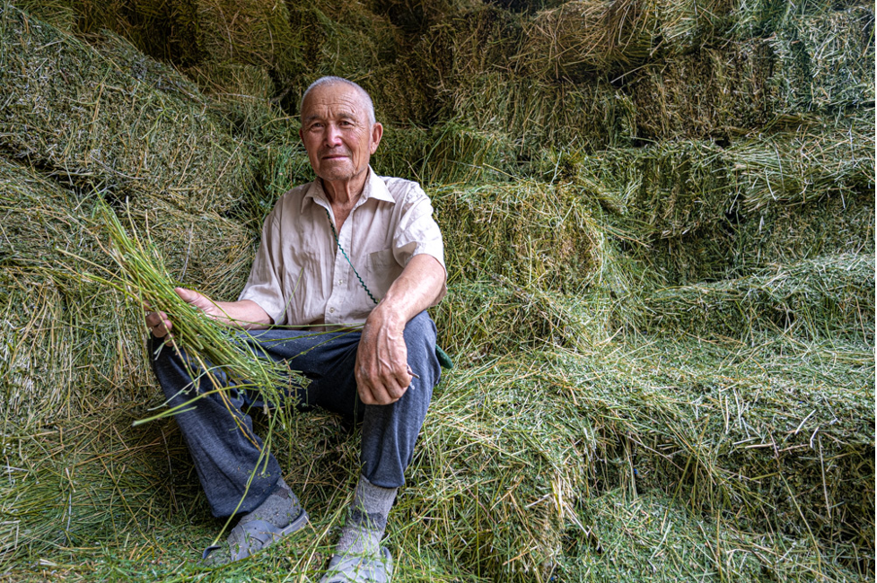 Figure: Farmer Aidarhan Nurbekov of the farm "Baiterek" in the Almaty region of Yenbekshi, in his alfalfa hay shed. Photo Shource: Michael major/Crop TRust