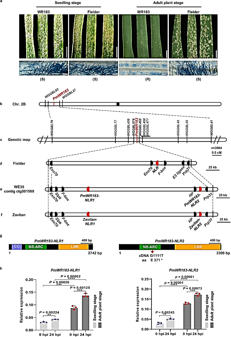 a Seedling and adult plant responses of parental lines WR183 and Fielder to Bgt isolate E20. Plant leaves were detached and photographed at 10 days post-inoculation (dpi) of the two-leaf (seedling) and 20 dpi of the jointing (adult) stage. Scale bar, 0.5 cm. R and S under pictures indicate the resistance and susceptibility of the plants to Bgt, respectively. Fungal structures of Bgt isolate E20 at 5 dpi (seedling stage) or 10 dpi (adult stage) were stained by Coomassie Brilliant Blue, respectively. Scale bar, 100 μm. b, c Genetic map of PmWR183 on the chromosome arm 2BS. d–f Physical map of PmWR183 locus on Fielder, contig ctg001568 of WE35, and Zavitan (WEW v1.0) reference genome, respectively. The red boxes indicate NLR genes. g Genomic structure and variations of PmWR183-NLR1 and PmWR183-NLR2 genes in WR183 and Zavitan. The nucleotide and corresponding amino acid change in PmWR183-NLR2 are shown as indicated. h The relative expression levels of PmWR183-NLR1 and PmWR183-NLR2 in WR183 at both seedling and adult plant stages under mock (uninoculated) and Bgt isolate E20 inoculation. Leaves from WR183 were collected 24 h after Bgt inoculation at both the two-leaf (seedling) and jointing (adult) stages. TaActin was used as the endogenous control. Data are means ± SEM (n = 3 biologically independent samples). Data were analyzed by two-tailed Student’s t-test (**p < 0.01, ***p < 0.001, ****p < 0.0001). Source data are provided as a Source data file.