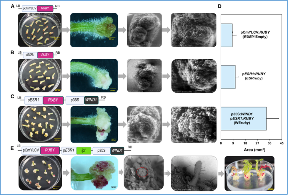 Figure: Experimental validation of gene constructs designed to assess proAtESR1-driven gene activation in response to AtWIND1 expression.