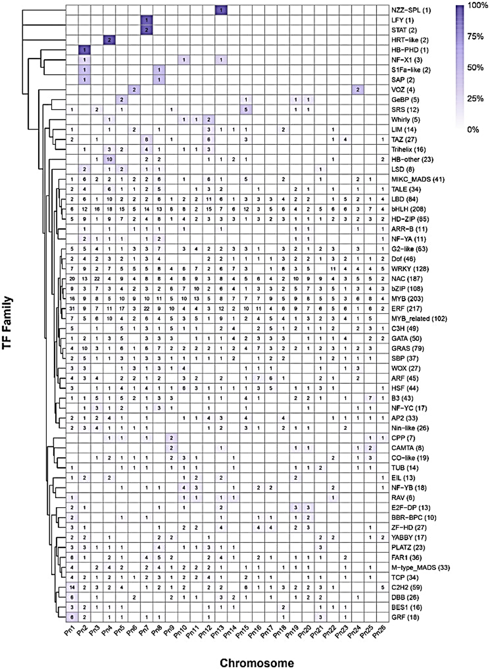 Chromosomal distribution of PnTF families. The heatmap shows the distribution of PnTF-encoding genes across chromosomes, with each cell indicating the number of genes for a specific TF family on that chromosome. The color intensity in each cell provides a visual representation of the gene density for each TF family across different chromosomes