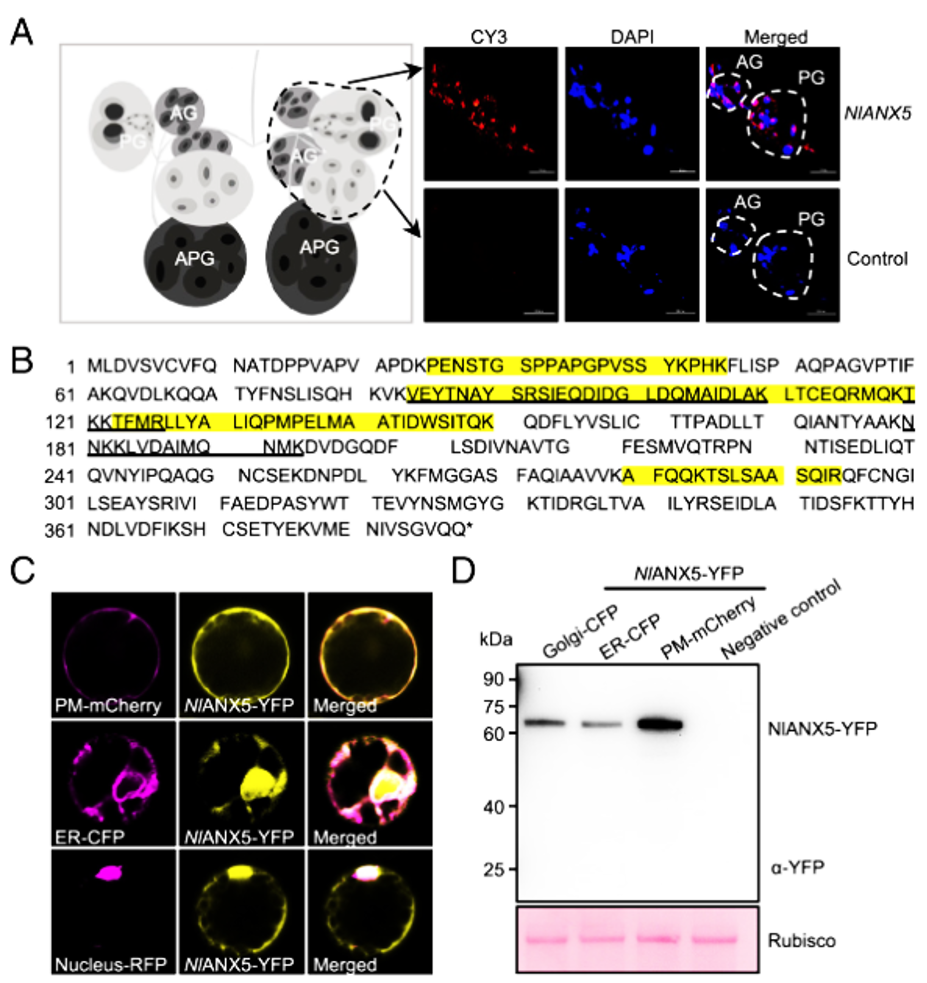 Characterization of NlANX5. (A) RNA in situ hybridization of NlANN5 in salivary glands isolated from 5th instar BPHs (Upper row). The sense probe was used as a negative control (Lower row). PG, principal gland. AG, accessory gland. APG, a-follicle of the PG. (B) The amino acid sequence of NlANX5. The yellow highlighted amino acid residues indicate the peptides detected in BPH-fed rice sheath tissue by LC–MS analyses. The asterisk indicates the stop codon. The underlined amino acid residues indicate the peptides detected in the phloem exudate of BPH-infested rice by LC–MS analysis. (C) NlANX5 is localized in the plasma membrane (PM), endoreticulum (ER), and nucleus of rice cells. PM protein-mCherry and NlANX5-YFP fusion, ER protein-CFP and NlANX5-YFP, or Nucleus-RFP and NlANX5-YFP proteins were coexpressed in rice protoplasts. The PM marker was the full-length Arabidopsis aquaporin 2A (AtPIP2A) (28), the ER marker was the signal peptide of Arabidopsis wall-associated kinase 2 (AtWAK2) (28), and the nucleus marker was the full-length Arabidopsis ELONGATED HYPOCOTYL 5 (AtHY5). See additional images in SI Appendix, Fig. S2. (D) NlANX5-YFP fusion protein levels in rice protoplasts are detected with anti-GFP (Abmart). Protein samples were extracted from rice protoplasts coexpressing Golgi-CFP and NlANX5-YFP, ER-CFP and NlANX5-YFP, or PM-mCherry and NlANX5-YFP, respectively. Proteins from mock rice protoplasts were included as negative control. Ponceau S staining of the gel shows overall protein loading. Experiments were repeated three times with similar trends.