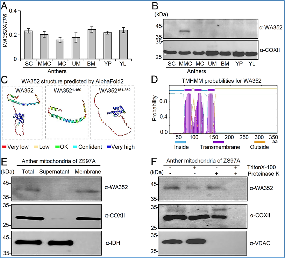 (A) The mitochondrial gene WA352 is constitutively expressed in anthers during the SC stage, MMC stage, MC stage, UM stage, BM stage, and in YP and YL of a CMS-WA line ZS97A. The mitochondrial gene ATP6 was used as an internal control, and WA352 transcript levels are shown relative to ATP6. Data are shown as means ± SD (n = 3). (B) Immunoblot of WA352 protein in different tissues and anther developmental stages of ZS97A. The mitochondrial protein COXⅡ was used as an internal control for loading, and stages are the same as in (A). (C) Structure of full-length and truncated forms of WA352 as predicted by AlphaFold2, showing an N-terminal transmembrane domain (amino acids 1 to 150, WA3521–150) and C-terminal conserved region (amino acids 151 to 352, WA352151–352). Amino acids are colored based on their per-residue confidence scores. (D) WA352 transmembrane domains predicted using TMHMM2.0. The three-transmembrane helical domain at the N terminus is shown in purple. (E) Mitochondria protein samples from anthers at the MMC stage were separated into soluble supernatant and membrane fractions and used to analyze the localization of WA352 by immunoblotting. COXⅡ was used as a control mitochondrial membrane protein, and IDH was used as a control soluble matrix protein. (F) WA352 localizes to the inner mitochondrial membrane. Mitochondrial fractions treated with (+) or without (−) the membrane-dissolving reagent Triton X-100 and the protein-digesting enzyme proteinase K. COXⅡ was used as an inner membrane protein control, and VDAC was used as an outer membrane protein control.