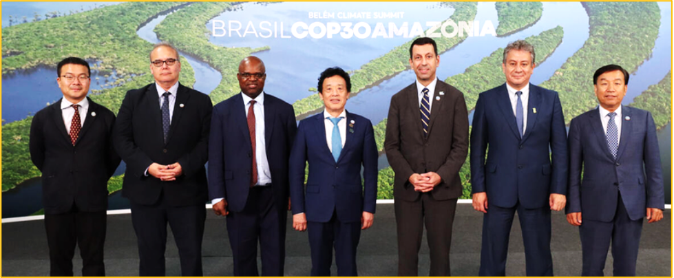 Figure: FAO's Delegation at COP30 (L-R): Mr Shen Hong, Assistant to DG; Mr Maximo Torero, Chief Economist; Mr Godfrey Magwenzi, Chief of Cabinet and DDG; FAO Director-General QU Dongyu (C); Mr Kaveh Zahedi, OCB Director; Jorge Meza FAO’s Representative in Brazil; Mr Zhimin Wu, NFO Director. ©FAO / Max Valencia