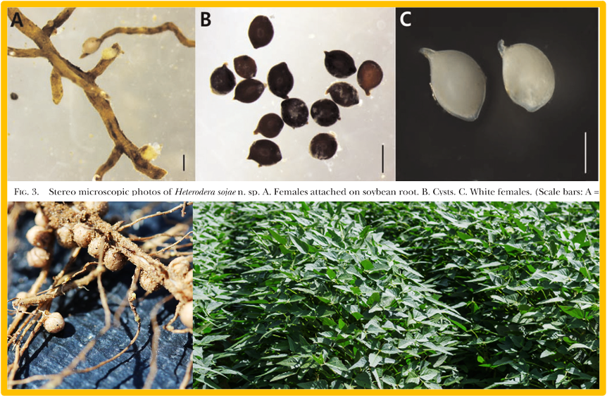 Tuyến trùng Heterodera sojae là loài tuyến trung có nang mới được phát hiện, chúng ký sinh rễ đậu nành, làm suy giảm tăng trưởng và năng suất. Tuy nhiên, genes gắn liền với tính kháng H. sojae của đậu nành chưa được biết rõ. GWAS (genome-wide association study) được áp dụng để tìm các gen đích điều khiển tính kháng tuyến trùng đã được tiến hành trên tập đoàn đậu nành vó 385 mẫu giống, sử dụng phương pháp Axiom 180 K SoyaSNP array và dữ liệu “whole-genome sequencing”. Mười ba chỉ thị phân tử SNPs được xác định; trong đó có 4 SNPs định vị trên nhiễm sắc thể 1 và 18; được tuyển chọn để phân lập gen kháng ứng cử viên và phát triển chỉ thị phân tử KASP (kompetitive allele-specific PCR) phục vụ đáng giá genotyping hiệu quả hơn. Phân tích haplotype thấy rằng 16 gen ứng cử viên có trong hai “haplotype blocks” kế cận với những SNPs này, gắn kết có ý nghĩa với tính trạng kháng tuyến trùng H. sojae. Chức năng của những gen này được dự đoán trên cơ sở “JGI Plant Gene Atlas”, mà công cụ ấy chỉ ra rằng chúng chỉ biểu hiện đặc biệt ở rễ đậu nành mà thôi. Những chỉ thị KASP phát triển trên cơ sở SNPs có thể được sử dụng để hoàn thiện chiến lược MAS trong chương trình cải tiến giống đậu nành cao sản kháng tuyến trùng H. sojae.